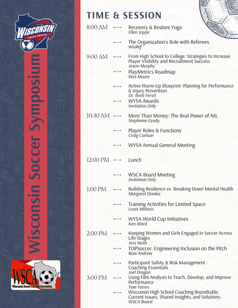 The Wisconsin Youth Soccer Association (WYSA), in partnership with the Wisconsin Soccer Coaches Association (WSCA), is hosting the inaugural Wisconsin Soccer Symposium. This event brings together coaches, administrators, referees, and organizational leaders from across the state for a full day of high-quality education, collaboration, and shared solutions. The Symposium focuses on elevating the soccer experience for everyone in Wisconsin (club, high school, and college) through practical learning, expert-led sessions, and open dialogue.